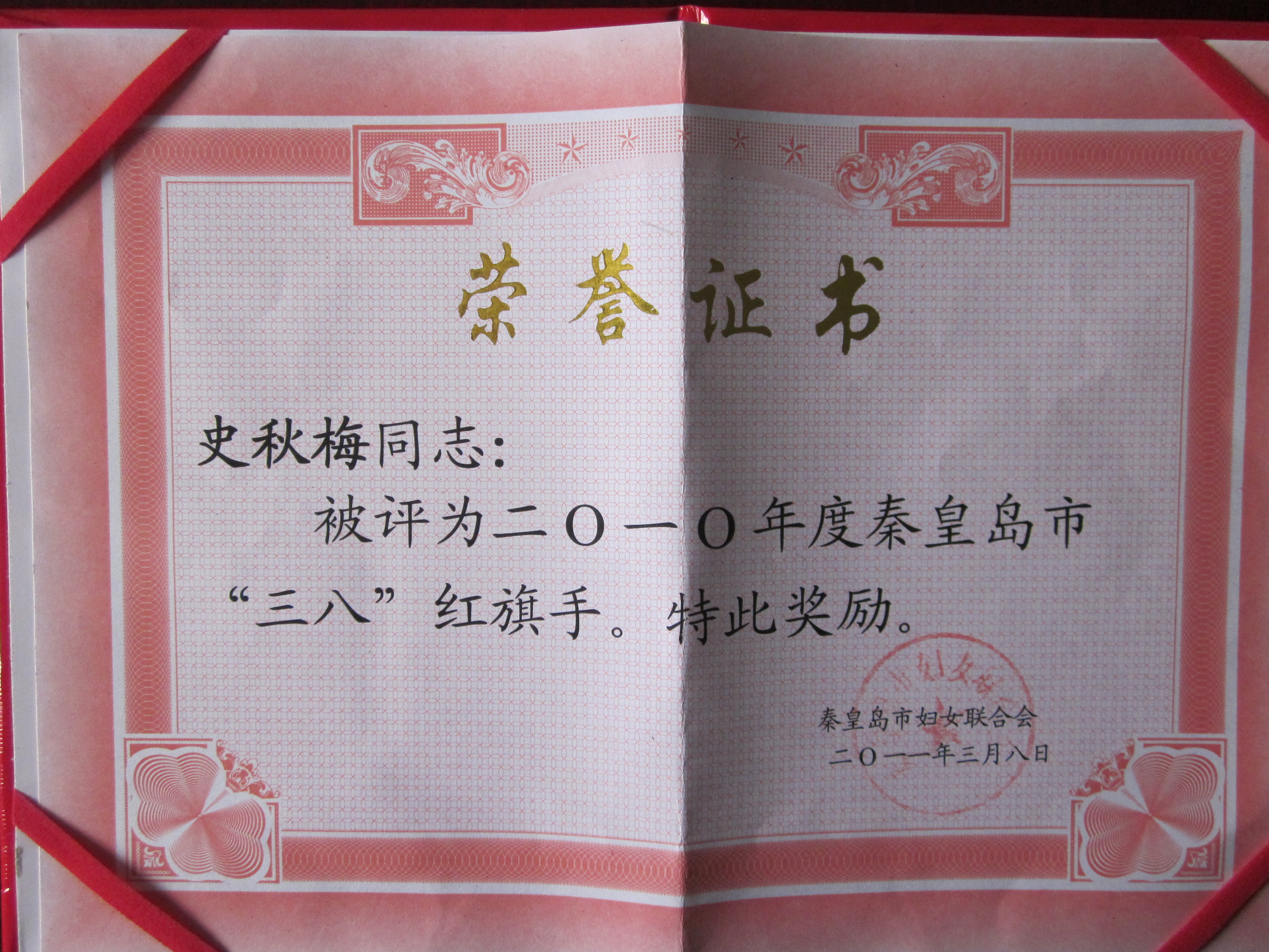 喜讯二:公司史秋梅老师被评为“2010年度秦皇岛市三八红旗手”