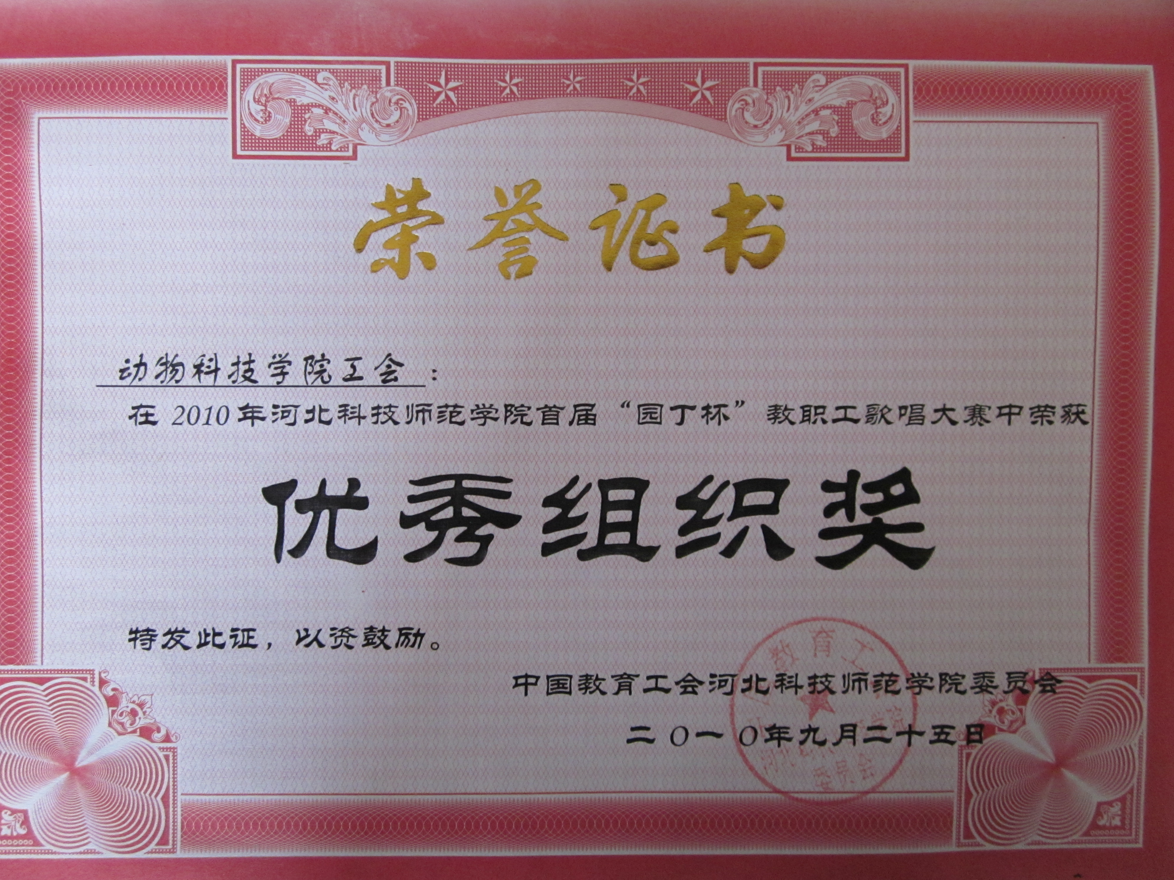 喜讯四:公司工会在2010年校首届“园丁杯”教职工歌唱大赛中荣获“优秀组织奖”