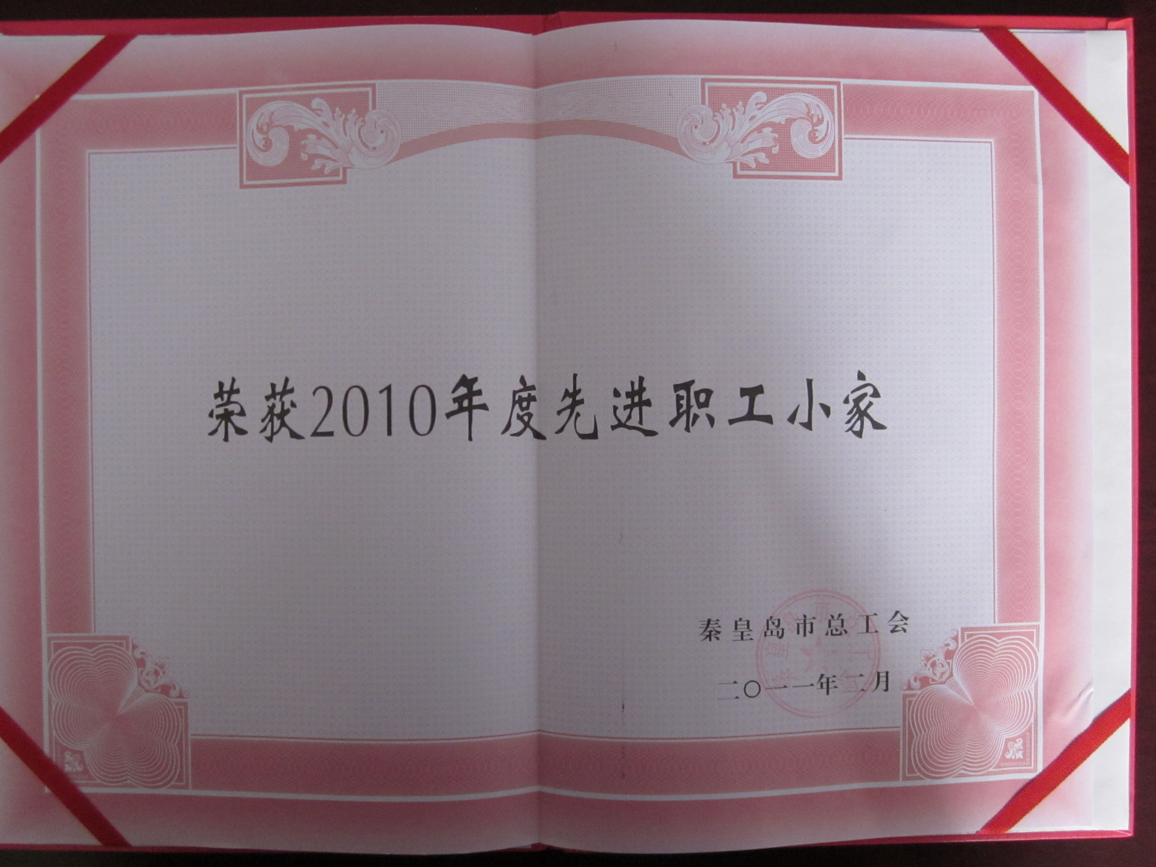 喜讯一:公司被秦皇岛市总工会授予“2010年度先进职工小家”荣誉称号